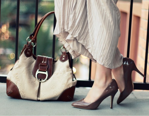 American Living sweater and bag, Club Monaco Ella skirt, gifted B Brian Atwood pumps, Hermes bangle, Kenneth Jay Lane earrings.