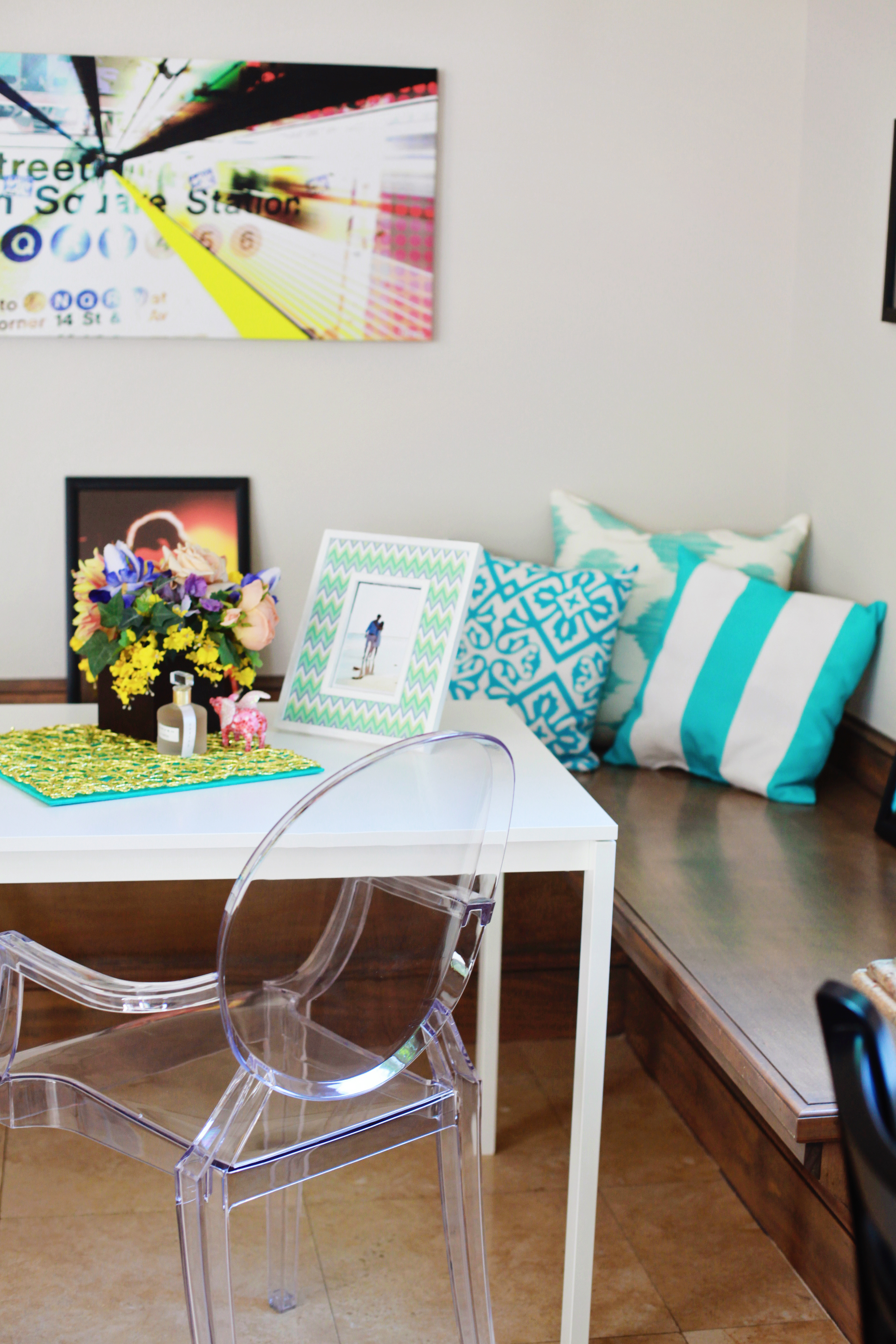 However, a few weeks ago, Lulu and Georgia offered me some pieces from their beautiful website -- and I figured this was a great opportunity to update our little nook. I picked up a white table from Ikea and matched it to their Xandra chair. I wanted a light, bold, breezy look for this little corner, and the clear lucite chairs were exactly right.