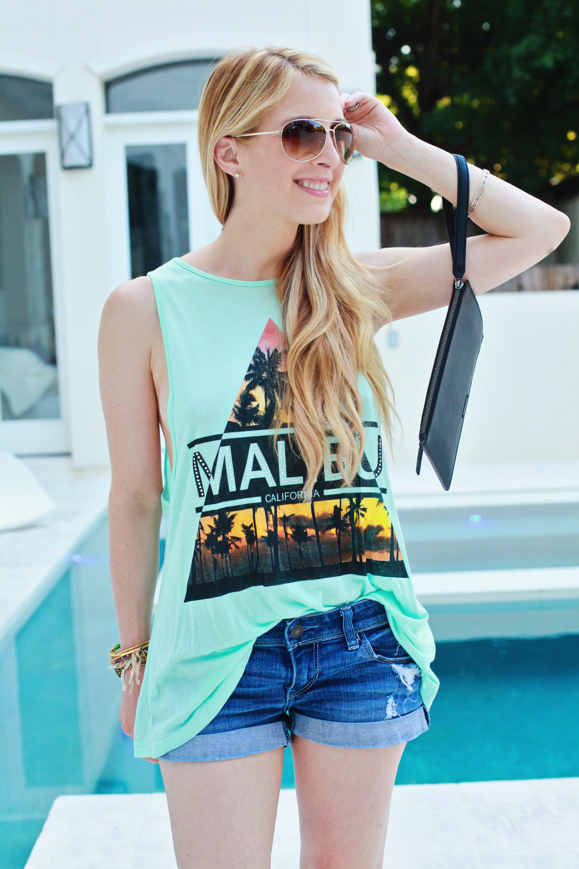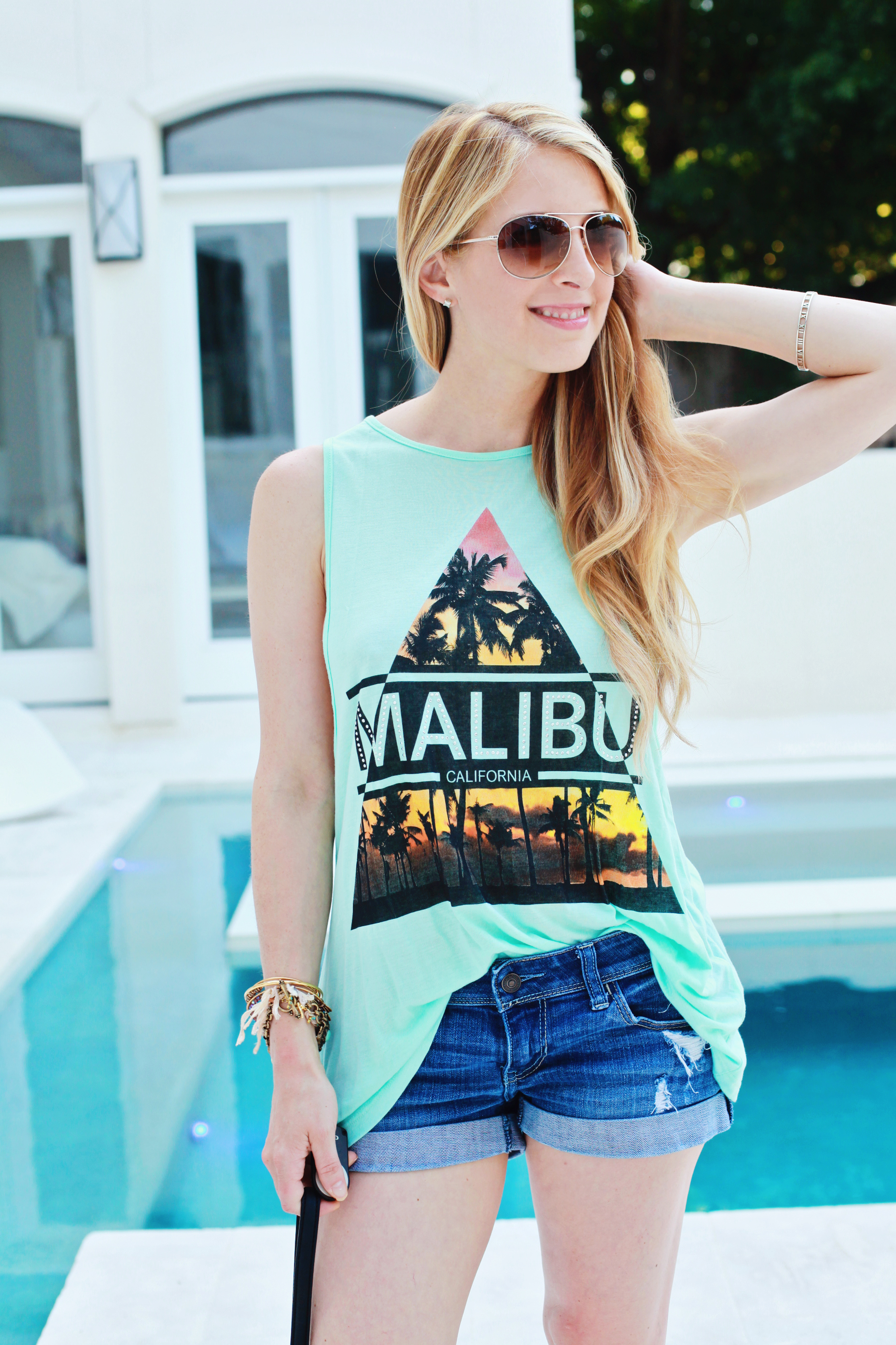 Foster Grant sunglasses, The Classic tank, Abercrombie shorts, Tiffany & Co., Ettika and Alex and Ani bracelets.