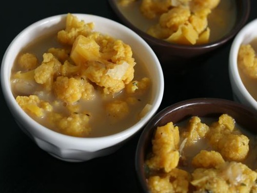 2. Pour in vegetable stock, and add cauliflower and spices. Simmer 15 minutes, and then stir in parsey and milk. Simmer an additional 5 minutes, remove the bay leaves, and serve.
