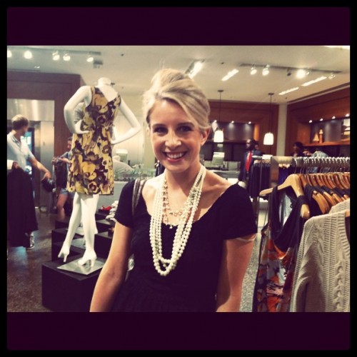 Photo 1: Madewell top, Zara skirt and heels, Alexis Bittar bracelet, DANNIJO bracelet. Photo 2: Gifted Mad Men dress from Banana Republic, Banana Republic pearls and heels.
