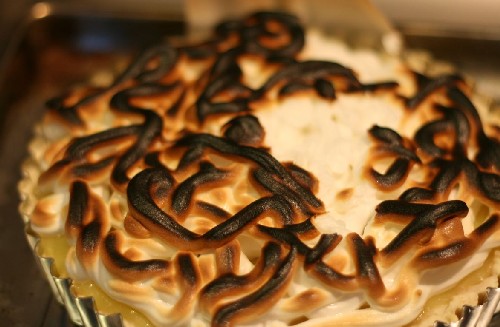 I know, I know. Doesn't that just look delicious? Amazingly, I was able to turn the above mess into an actually edible pie. The broiling only burned the very top layer of the meringe, so I literally just scraped it off with a knife. Took a while, but I was left with a more-or-less uncooked layer of meringue underneath.