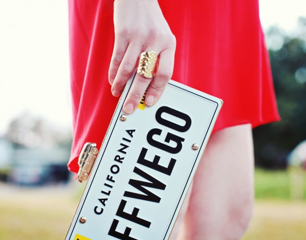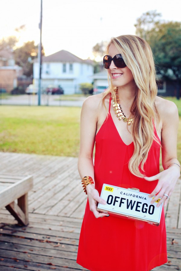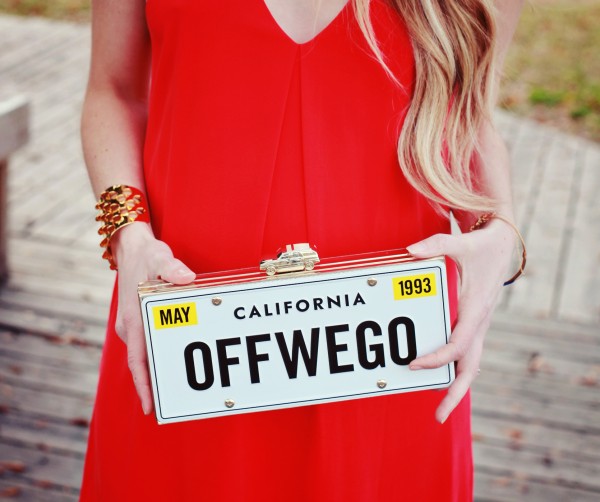 Alice and Olivia Fierra dress, Alexis Bittar bracelet, Kate Spade clutch.