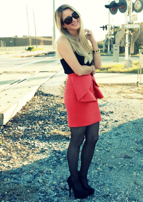 Lanvin top, ASOS skirt, gifted Falke tights, Alexis Bittar and J. Crew bracelets, gifted Payless heels, gifted Chanel sunglasses (via Lenscrafters).