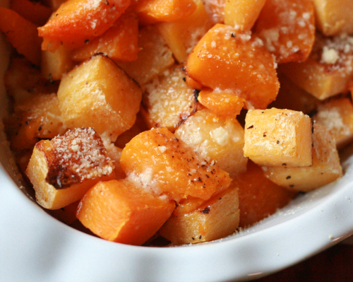 But root vegetables -- especially squash -- can actually be pretty delicious, with the right preparation and flavorings. This dish is so simple, roasted just enough to bring out the natural flavor of the squash, and combined with just a bit of olive oil and cheese, but it tastes just as good as any dish you'd spend hours on.