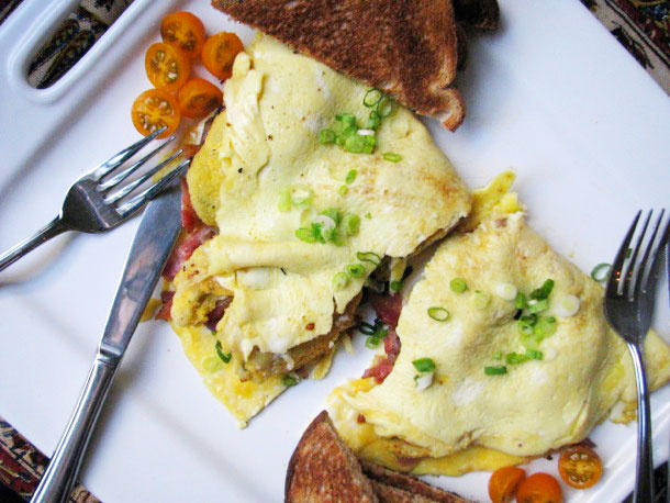 Coat each oyster in flour, then egg, then cornmeal, and reserve until ready to use. Fry the bacon over medium heat in large skillet until bacon is fully cooked and brown. Remove and drain on paper towel and once cool enough to handle, coarsely chop. Add breaded oysters to remaining bacon fat in pan and cook until oysters are just firm and cornmeal begins to brown, about 2 minutes per side. Remove oysters from pan and reserve. Add onions to what’s left of the oil in the pan and cook until soft, about 5 minutes. Remove skillet from heat and carefully wipe with paper towel, or wash completely and place back on heat. Melt butter over medium heat and season the beaten egg with a pinch of salt and pepper. Once bubbles have subsided, add beaten egg, swirling pan so that egg coats the entire bottom. When egg has set, but is still a little wet on the top, gently slide onto a large dish or platter. Scatter bacon, onions and oysters on one side of omelet and gently fold the other half of the omelet across the filling. Scatter with scallions and serve with buttered toast and Bloody Marys.