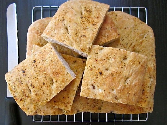 The night before, combine the flour, salt and yeast in a large pot or bowl. Stir until everything is evenly combined and then stir in the water. The result should be one cohesive, sticky, shaggy lump of dough. If there is still dry flour in the pot or everything isn’t sticking together, add a little water at a time until it forms one ball. Loosely cover and let sit at room temperature until the next day . The next day the dough will be wet, fluffy and may even be bubbling from the fermentation. Using a spatula, scrape the dough from the sides of the pot or bowl and turn it in on itself a few times until it forms a ball in the center of the pot. Prepare a baking sheet with foil, non-stick spray and a generous sprinkle of corn meal. Dust your hands with flour and sprinkle a little on top of the dough to keep it from sticking to your hands. Transfer the dough to the baking sheet. Stretch and pat the dough out into a large rectangle. You may need to dust your hands with flour throughout this process to keep the dough from sticking. It will be very wet and sticky. Drizzle olive oil over the surface of the dough and use a soft brush to spread it evenly over the surface. Sprinkle the Italian seasoning over top. Let the dough rise for another hour. Preheat the oven to 425 degrees. Using your fingers, press dimples into the risen dough . Bake the focaccia for 20-25 minutes in the preheated oven or until the surface is golden brown. After removing from the oven, transfer the focaccia to a wire rack to cool.