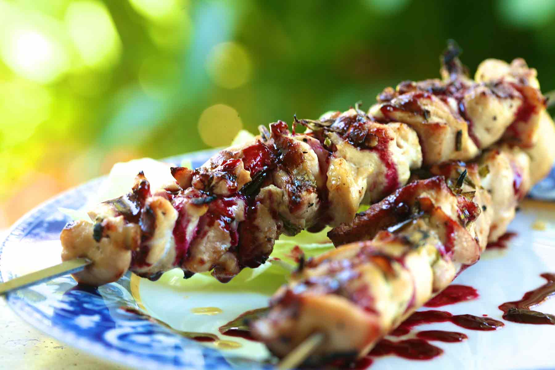 To serve, plate the skewers and spoon the sauce over the chicken. Serve immediately.
