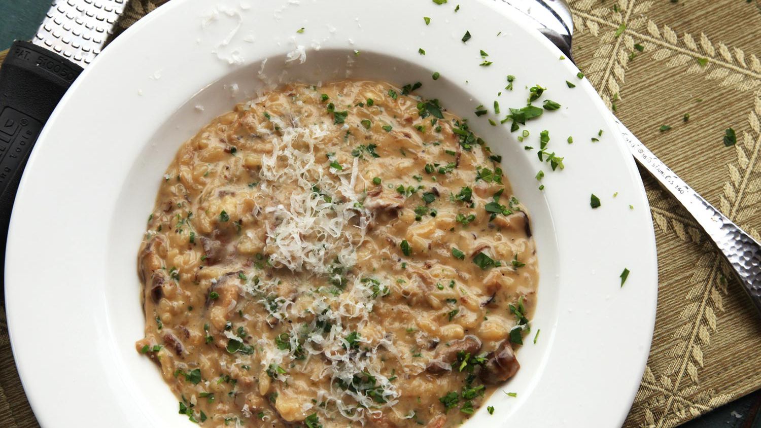 Place chicken stock and dried mushrooms in a microwave-safe container and microwave on high power until simmering, about 5 minutes. Remove from microwave. Using a slotted spoon, transfer porcini to a cutting board and roughly chop. Add fresh mushroom scraps to container with porcini-infused stock and set aside.