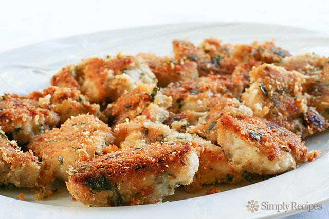 Piece by piece, dip the chicken pieces into the garlic melted butter, and then dredge into the Parmesan breadcrumb mixture to coat.