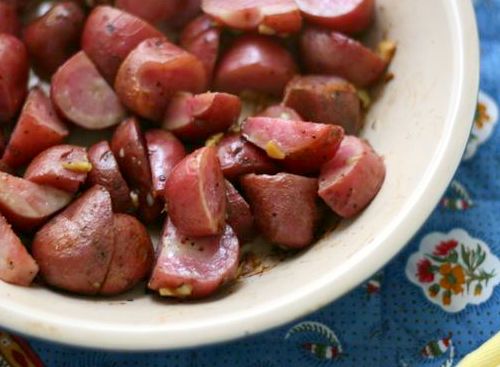 Preheat the oven to 450 degrees. Cube the potatoes, or halve them for the very small ones. Toss the potatoes with garlic, olive oil, salt and pepper and arrange in a baking dish.