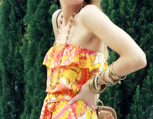 Gifted Trina Turk for Banana Republic dress, gifted Samantha Wills bracelets (similar), C. Wonder necklace (similar) and ring, Miu Miu bag.