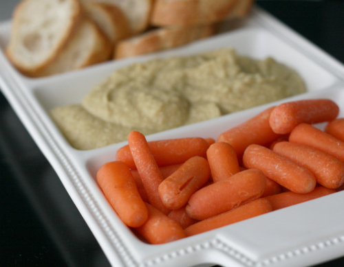 Roast the garlic at 450 degrees for about 20 minutes in a little bit of olive oil. When the garlic is done, in a food processor, combine the chickpeas (including the water from one of the cans), artichoke hearts, garlic, tahini, lemon juice, salt and olive oil. Process until smooth.